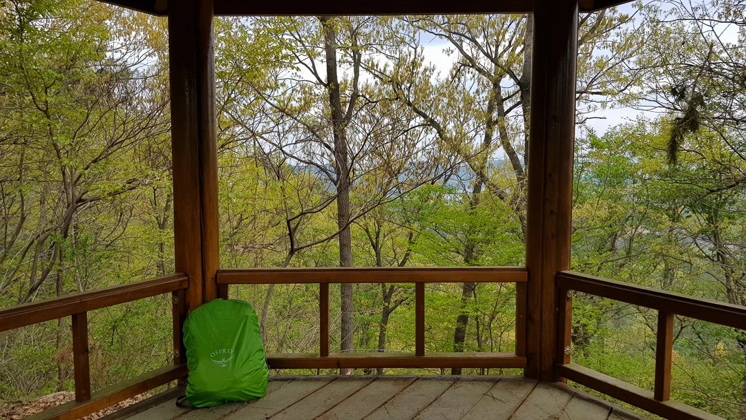 After you’ve gotten your fill of the peak, keep on following the trail. You will come across an old picnic table. The trail continues past it down some stairs, but before you go, head out to the ridge clearing beyond the picnic table for a view looking towards Chilcheondo, then make your way back to the trail.