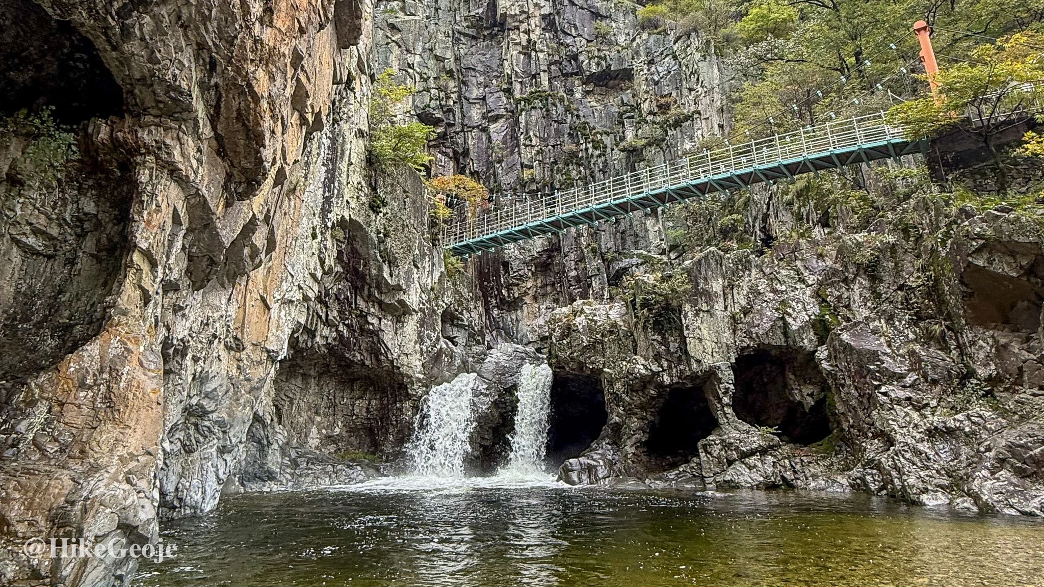 After retracing our steps, we made sure not to miss Gwangeum Falls and its suspension bridge backdrop. From the bridge, you can scramble down to the rocks below for the best shot with Yeonsan Falls, the most impressive of the bunch. We were lucky to get our photos before a long line formed behind us.