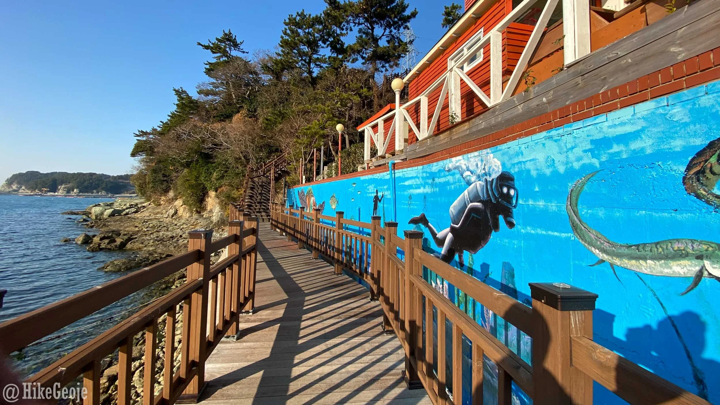 If you have time, keep going straight where you first arrived and then follow the wooden walkway to the left (if you are facing the cafe) passing the scuba diving mural.
